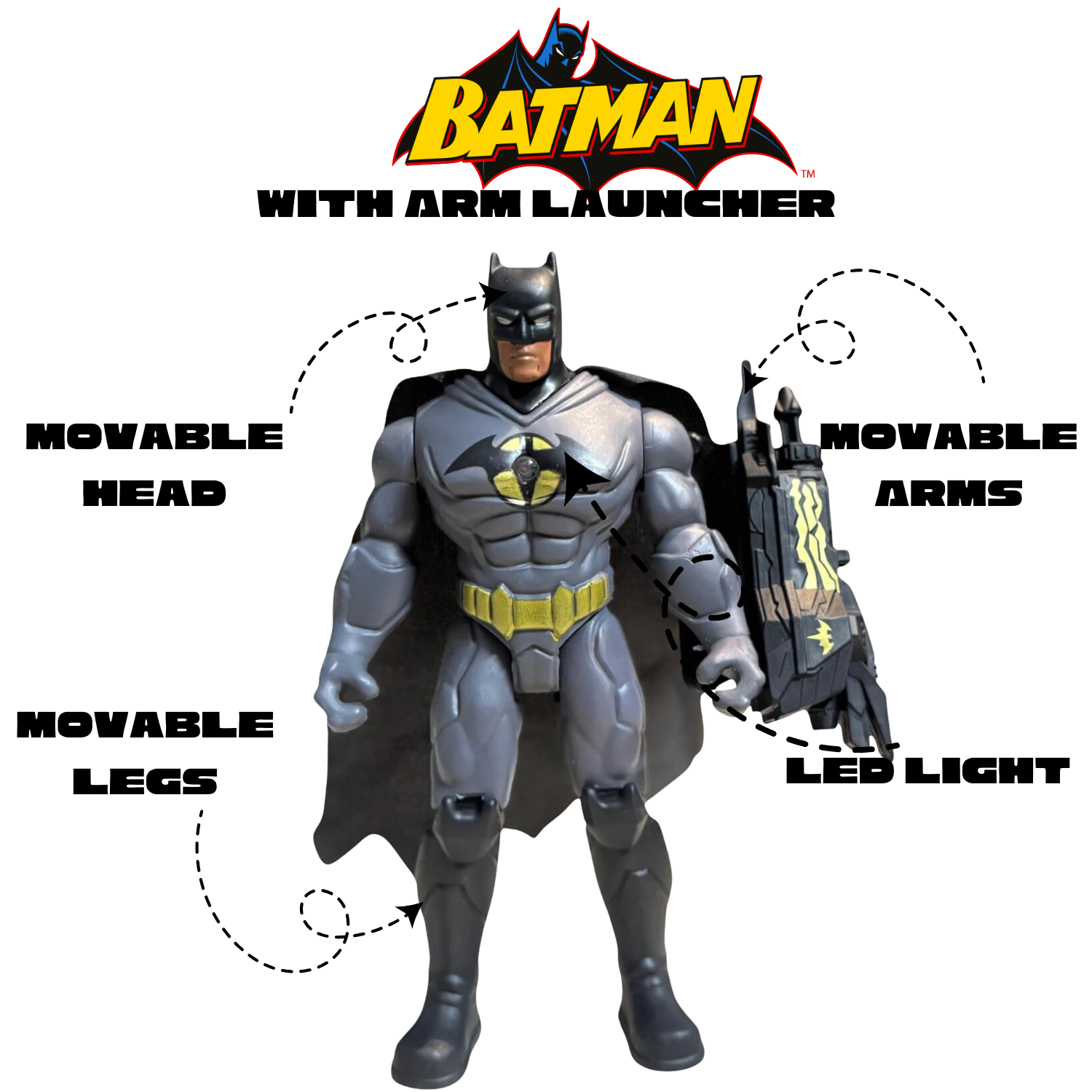 Bring justice to the streets with this Batman action figure! Featuring a glowing red LED light in the chest and a powerful arm launcher, this toy offers endless superhero action for kids aged 3 and above. Designed for exciting battles and imaginative adventures, it’s a must-have for every young hero.