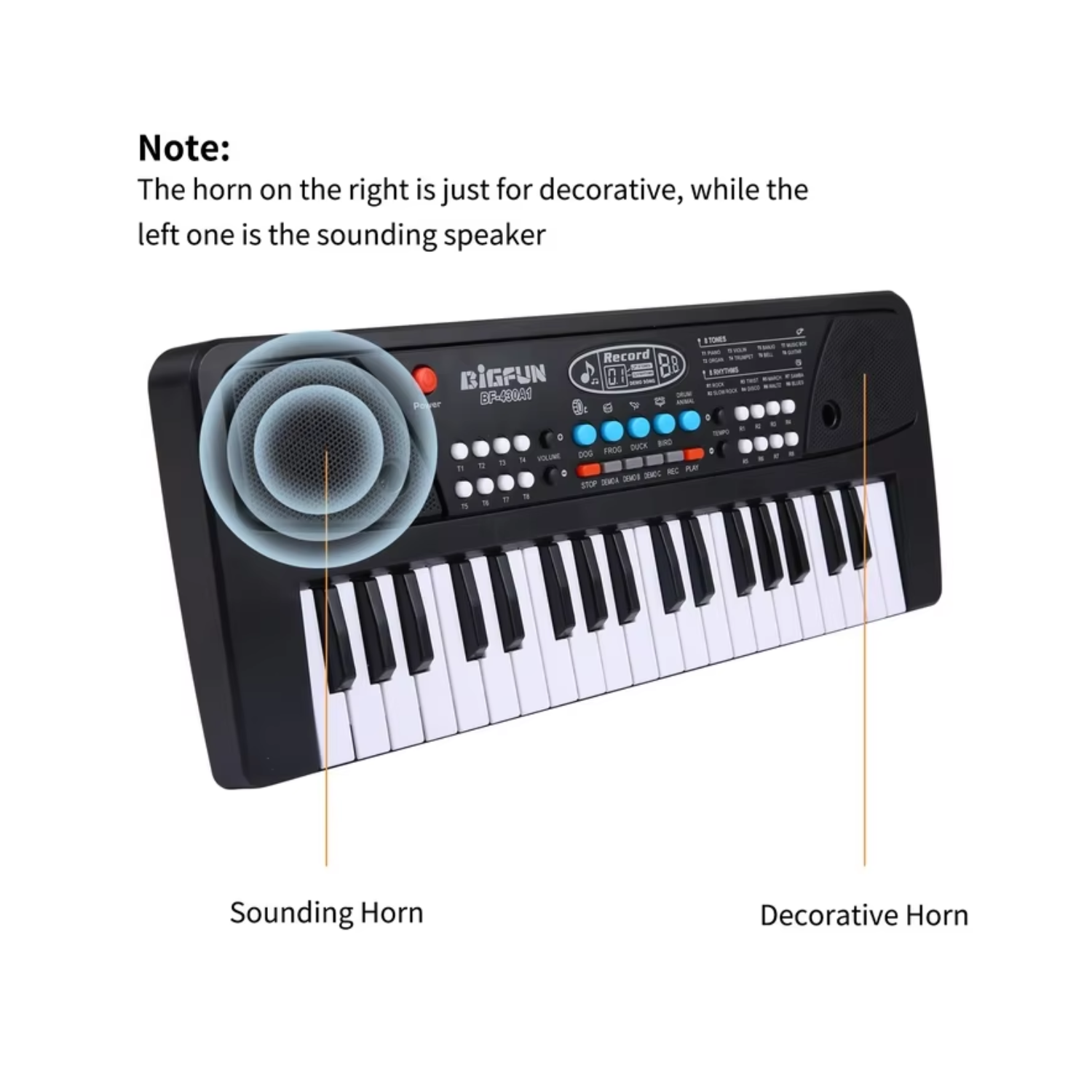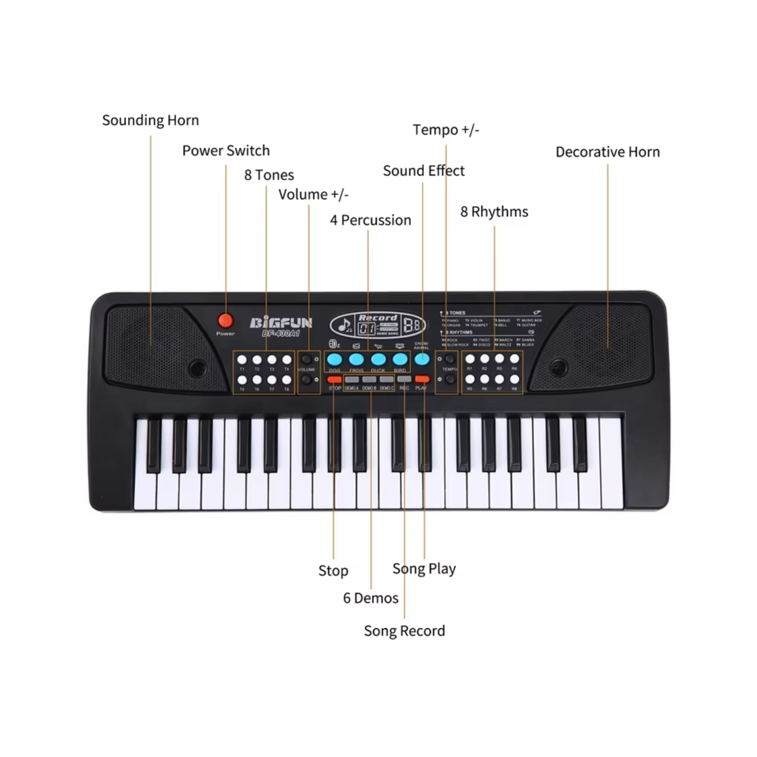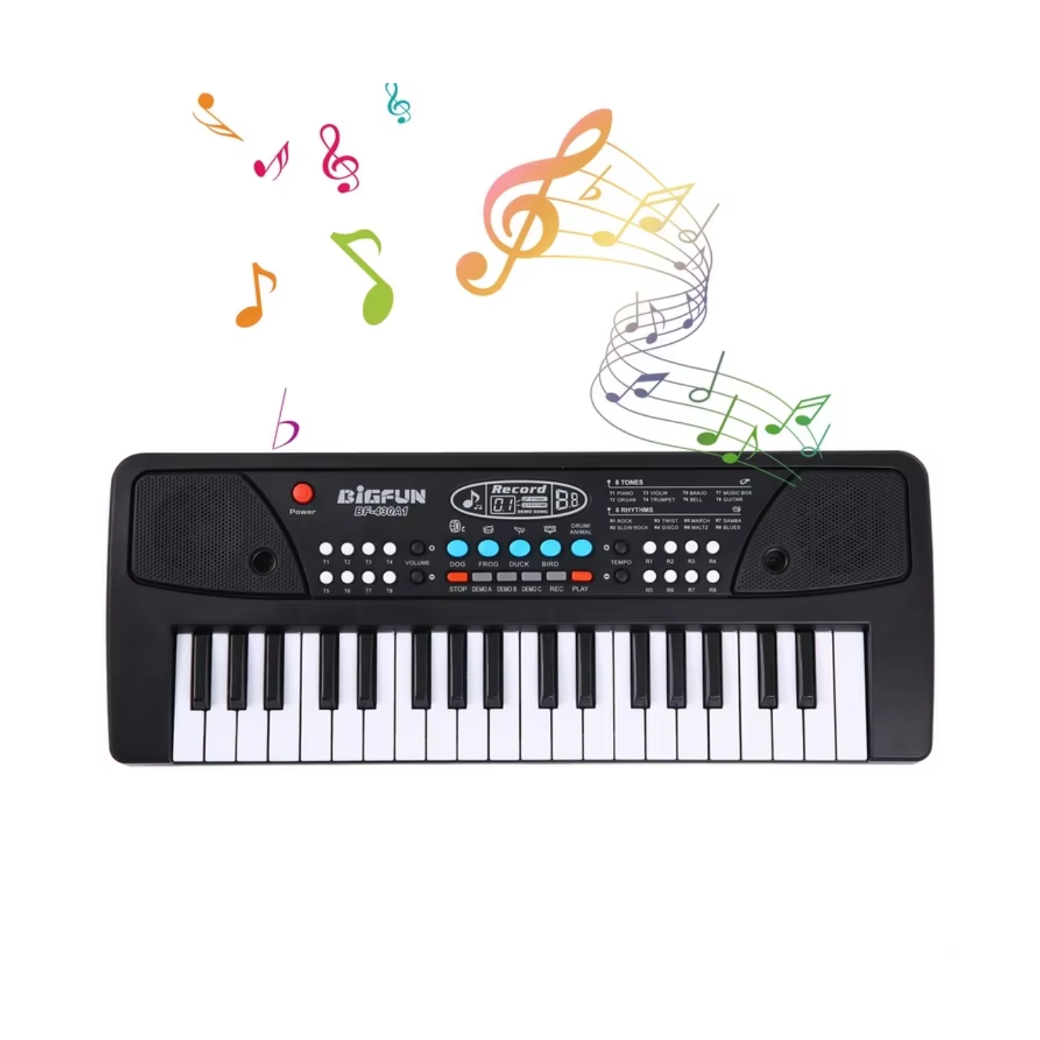 • Press different keys, tones, and rhythm buttons to explore sounds, melodies, and demo songs.