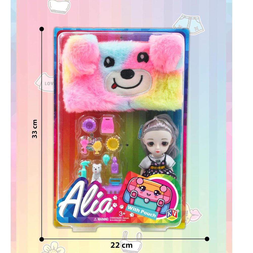 Delight your little one with the adorable Alia Mini Princess Doll Set, a complete pretend play package that includes a stylish mini doll, playful travel accessories, and a soft plush bear-face pouch. Perfect for on-the-go fun, the set comes in vibrant colors with surprise accessories like suitcases, sunglasses, pets, and more. Designed to boost imaginative play, this compact kit is a wonderful gift for girls who love dressing up dolls and creating travel adventures!