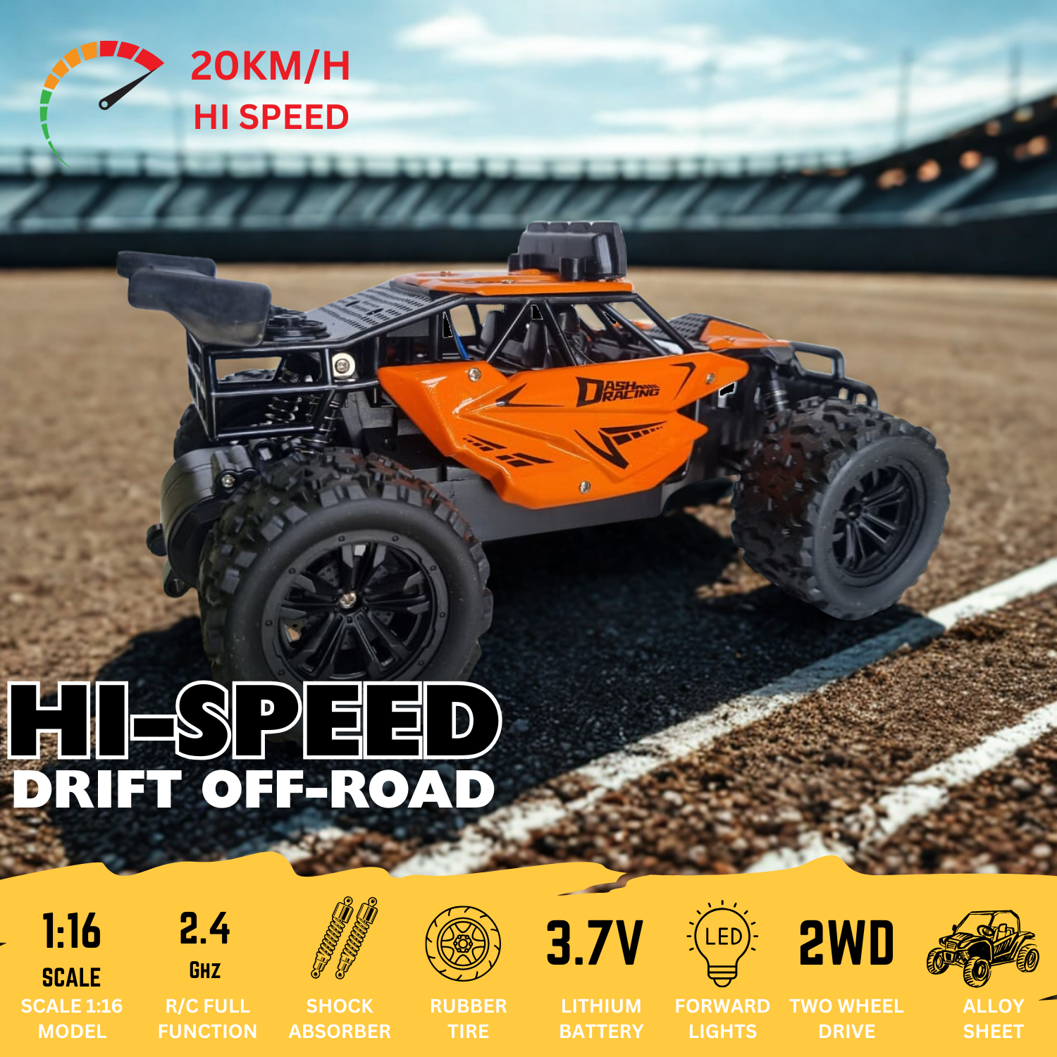 Unleash the thrill of racing with the Toyboi Hi-Speed Drift Off-Road RC Car! Built for kids and RC enthusiasts alike, this 1:16 scale off-road monster delivers 20km/h top speed, 2.4GHz remote control precision, and realistic drift performance on rugged terrains. Featuring shock absorbers, rubber tires, and LED forward lights, it’s perfect for both indoor and outdoor racing. Powered by a 3.7V rechargeable lithium battery, this drift car ensures long-lasting fun, while its durable alloy sheet body keeps it strong against rough play.